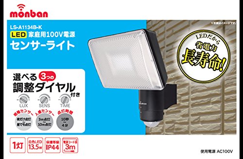 - 検知方式:赤外線受動式 使用電源:AC100V 50/60Hz 消費電力:約14.5W(待機時 約0.5W) 光源:白色LED(全光束 約1200ルーメン) 点灯保持時間:約10秒から約4分 外来固形物に対する保護/水に対する保護:IP44 (直径1.0mm以上の大きさの外来固形物に対して保護する/水の飛まつに対して保護する )