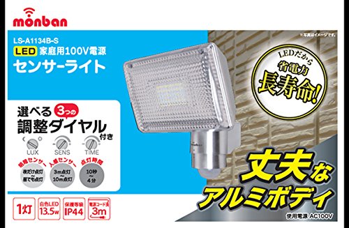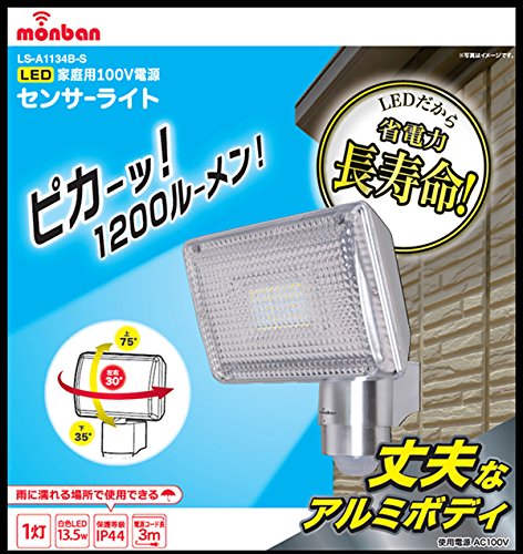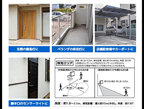 - 検知方式:赤外線受動式 使用電源:AC100V 50/60Hz 消費電力:約14.5W(待機時 約0.5W) 光源:白色LED(全光束 約1200ルーメン) 点灯保持時間:約10秒から約4分 外来固形物に対する保護/水に対する保護:IP44 (直径1.0mm以上の大きさの外来固形物に対して保護する/水の飛まつに対して保護する ) 使用周囲温度範囲:−5℃〜+45℃