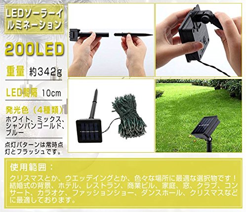 イルミネーションライト 200球 太陽光充電 電気代0円 LEDソーラーライト 防滴 屋外用 ブルー