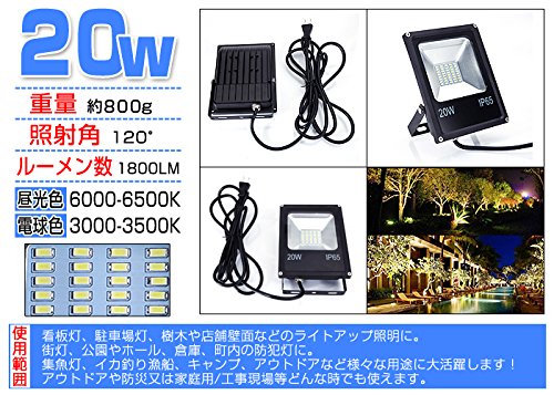 LED投光器 20W LED投光器 薄型 ブラック 防水加工 3mコード付き 3000-3500K 広角120度 看板灯 作業灯 駐車場灯 屋内 照明 屋外 電球色