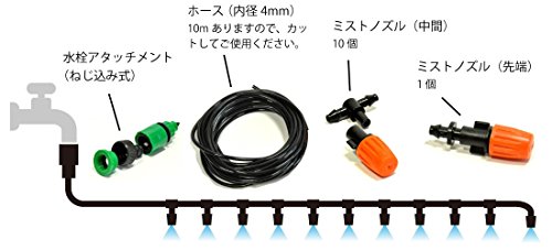 - 内容:ホース(全長約10m、内径4mm、外形7mm)/ミストノズル 11個/水道アタッチメント