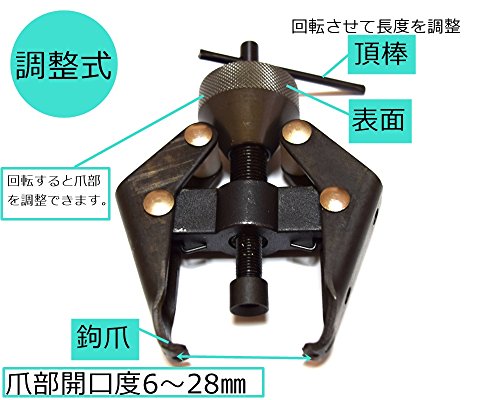 - ベアリング・ギヤ・シャフト・プーリー・ボルト抜取り、ワイパー、バッテリー引き出す工具として使用できます。 【商品仕様】材質:クロムバナジウム鋼、スプレープラスチックなど。 ◆サイズ:12㎝ x 8.5㎝ x 3.6㎝ 爪部開口度:6~28㎜。最大開口度:28㎜。最大軸リングサイズ:40㎜。