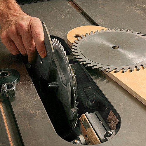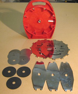 DADO(溝切り)。ブレードを重ねたり、シム(調整板)をたしたり除いたりしながら溝切りの幅を調整します。
