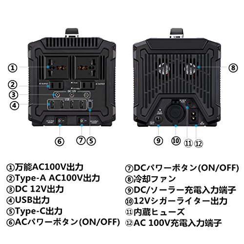 - 5Way出力式:ACコンセント(4口):110V/60Hz 400W(ピーク500W) DC12V出力端子(3口):12V/12A最大 シガーライターソケット:12V/12A 最大 USB出力端子(4口):5V/4A最大 USB Type-C 出力:5V/2.4A、9V/2.1A、12V/2.1A、14.5V/2A、20V/1.5A