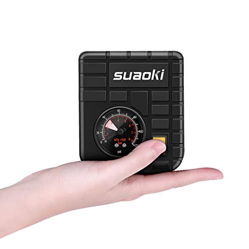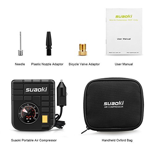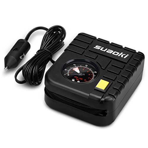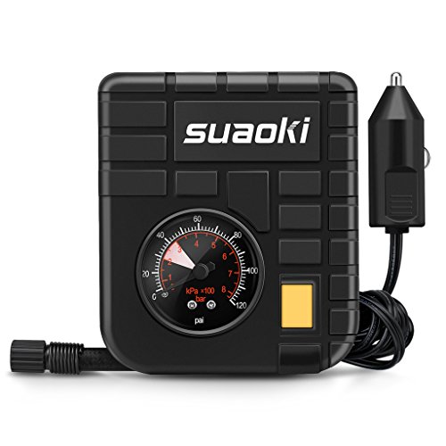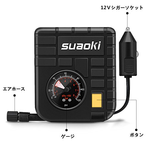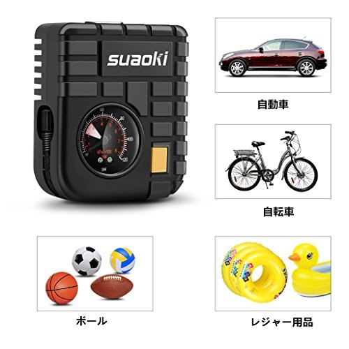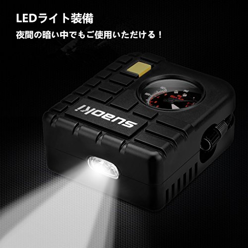 suaoki 改良版 エアコンプレッサー 車用空気入れ DC12V シガーソケット接続 最大圧力827kpa 3種類アダプターノズル付き LEDライト機能 空気圧測定 自動車 バイク 自転車 ボール 浮き輪 レジャー用品【一年間保証付き】
