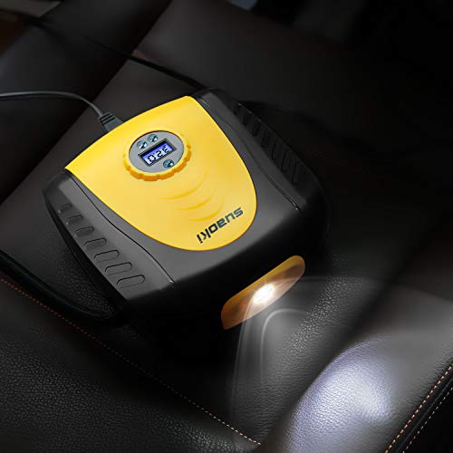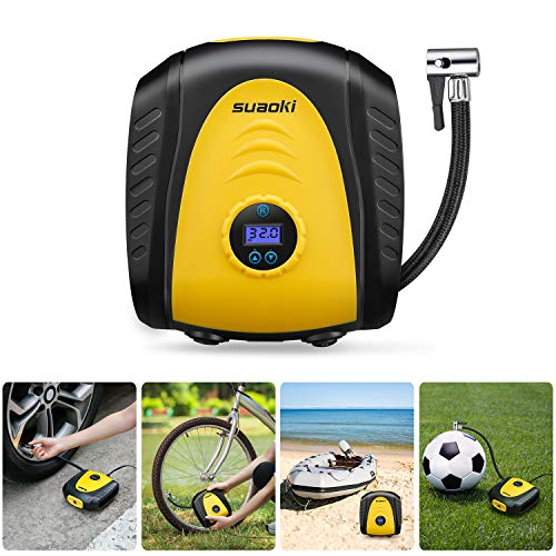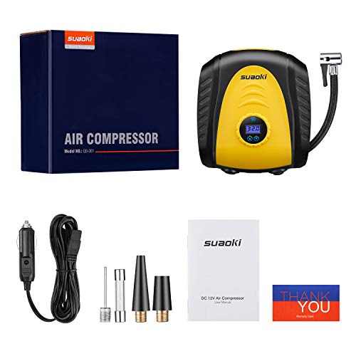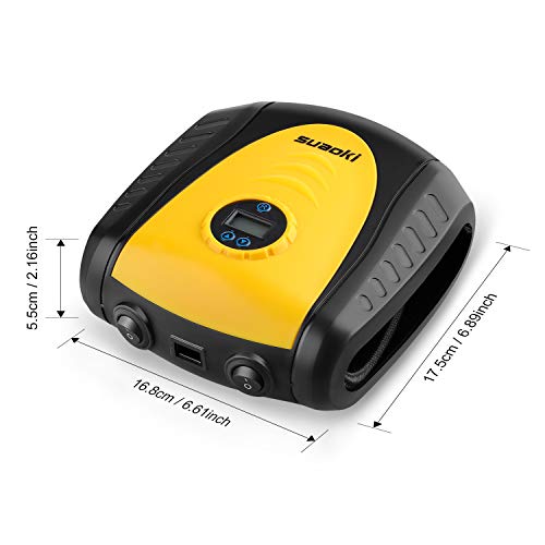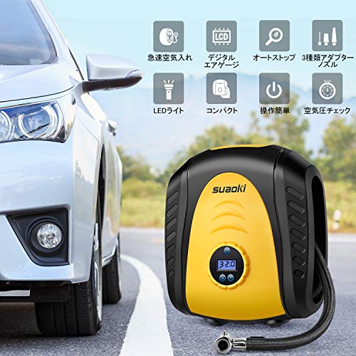 suaoki エアコンプレッサー エアゲージ 電動空気入れ 最高圧力1034kPa DC12V シガーソケット接続式 オートストップ LEDライト 3種類アダプターノズル付き 空気圧測定 自動車 バイク 自転車 プール 浮き輪 ボール レジャー用品対応 軽量コンパクト 12ヶ月保証