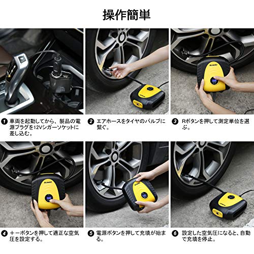 - 「一台3役、操作簡単」1台で空気入れ、空気圧チェックと空気を抜くことができ、またLEDライトもつき、懐中電灯にもなります。使い方は簡単で、電源プラグを12V車シガーソケットに差し込み、エアホースをタイヤのバルブに繋いだ後、電源ボタンを押すと、充填が始まります。設定した空気圧になると、自動で充填を停止。