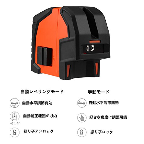 - モード:自動レべリングモード(自動補正範囲4°±1°)と手動モード 一つボタンで水平レーザー、垂直レーザー、クロスラインを切り替えることが可能です。