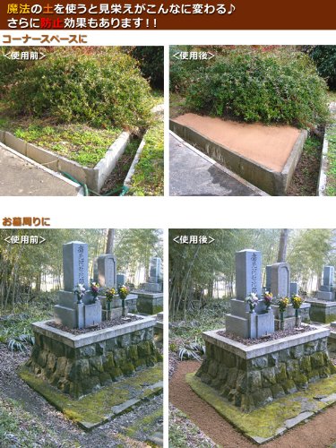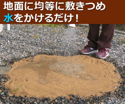 - 【ご使用方法】(1)地面に土をまく 余分な砂利や草を取り除き、地面を平らにします。厚みを考えて少し段差を作ります。魔法の土カチカチ君を袋から取り出し、使いたい場所にまきます。1袋で厚さ約3cm、範囲約58×58cm、2袋で範囲約100×100cmの面積を施工できます。(※施工厚さは下地の状況、人が乗る乗らない等の条件にもよりますが、1~3cm程度が必要です。)(2)均一にならす トンボ・木ごて等で均一に敷き詰めて下さい。ほうきで表面に模様をつけると自然な感じに仕上がります。(3)水をかける 上から均等にジョウロで水をまきます。1袋に対し、1L~1.2Lが目安です。施工後の状態や気候にもよりますが、夏場は1~2日、冬場は2~4日で固まります。施工後、表面が急に乾燥・凍結する可能性がある場合は、ビニール等で覆って養生して下さい。浸水性があり、まわりの樹木もそのまま育ちますので、植物も害しません。雨水などもしっかり下の土壌に還元してくれます♪(成分は天然川砂と無機系固化剤混和剤から作られています。六価クロムも含まない環境に優しいエコ商品です★)