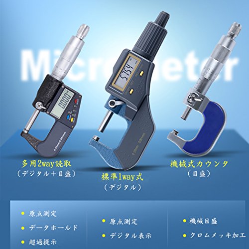 - セット内容:本体、LR44ボタン電池(本体に装着済)、ハードケース付き、子スパナ、マイクロメータ基準棒75mm