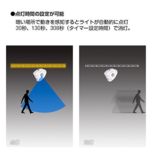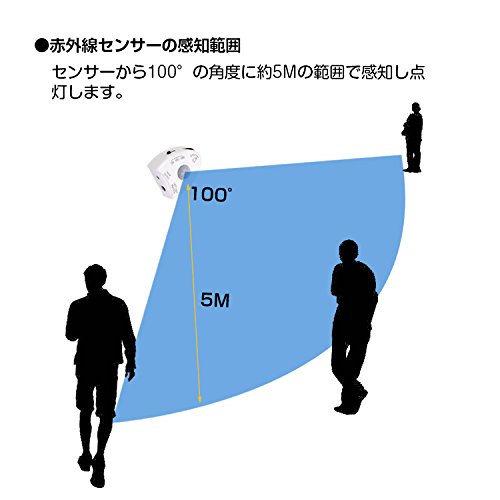 - 人感&夜間センサー:5m(100°)以内の動きを感知し、自動点灯できます。動きを感知しないと、タイマー設定時間後自動消灯します。