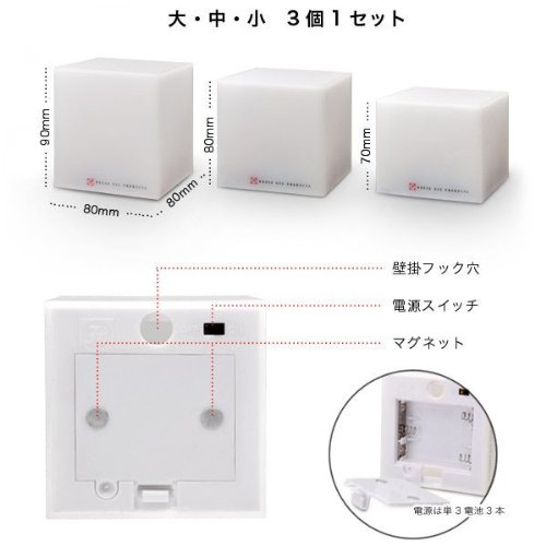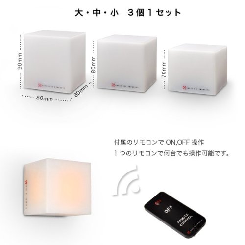 ロウソクの炎のように揺らめくLED リモコンで操作するキャンドルライト 本物の炎のようにゆらゆら揺らめくから 心温まるキャンドルライト。 だからその名もCOCOLO(ココロ)です。 大きさの異なる大中小の3個が1セットとなった ランタンは付属のリモコンで操作します。 スイッチを入れるとやわらかなオレンジ色の 光でお部屋を優しく包んでくれます。 そして1つのリモコンで全てのキャンドルライトが 操作できてとても便利です。 そして電源は1つで単3電池3本で稼働します。 だから万が一の停電にも一安心。 しかも本物の炎のように揺らめく灯りだから 急な停電による不安も癒してくれます。 背面にはマグネットが付いていて壁掛け用の穴も 開いているのでアイデア次第で様々な箇所に設置が可能。 リビングはもちろん寝室の補助ライトや玄関などにも◎ 夜が来るのが待ち遠しくなるココロ暖まる 癒し系キャンドルライト「COCOLO/ココロ」がオススメです。