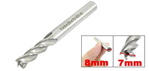 特徴:ストレートシャンク、4枚刃、HSSとアルミ材、7mm加工径、8mmシャンク径、75mm全長のデザイン。