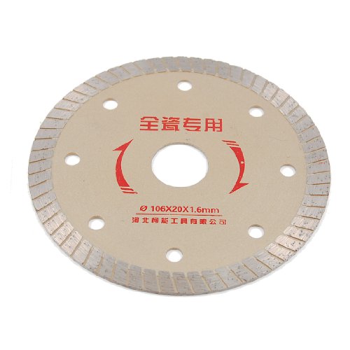 このダイヤモンドカッターでは外径が106mmで、内径は20mmです。ダイヤ幅は1.6mmほどあります。上質な材料を用いるため長持ちできます。