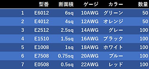 1 E6012 6sq 10AWG グリーン 50 2 E4012 4sq 12AWG オレンジ 50 3 E2512 2.5sq 14AWG グレー 100 4 E1510 1.5sq 16AWG ブラック 100 5 E1008 1sq 18AWG ホワイト 100 6 E7508 0.75sq 20AWG ブルー 100 7 E0508 0.5sq 22AWG レッド 100