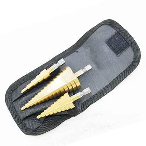 ステップドリル チタンコーティング 3本セット スパイラルドリル タケノコ 六角軸 収納ポーチ付き HSS鋼 穴あけ DIY 電動工具 (大)4-32 mm 15レベル(中)4-20 mm 9レベル(小)4-12 mm 5レベル