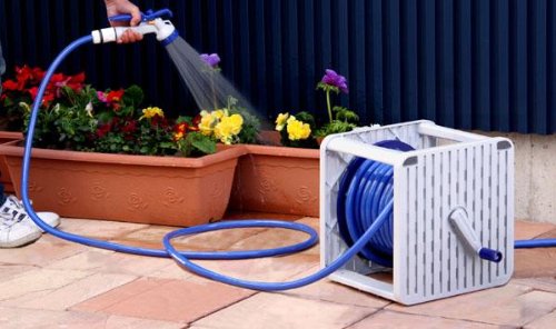 ホースは藻の発生しにくい、中黒の耐寒・耐圧ホース(20m付)を使用。蛇口からの着脱が簡単な3点ビス蛇口コネクターを使用しています。ノズルはワンタッチのカップリングで着脱が簡単 お庭の水遣りや、洗車に最適