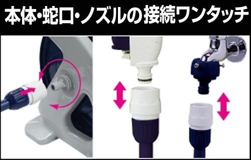 ハンドルに連動して動くホースガイド付きなので、ホースが偏ることなく巻き取ることができます。蛇口側ホースにはホースの折れを防ぐL型コネクター付きです。