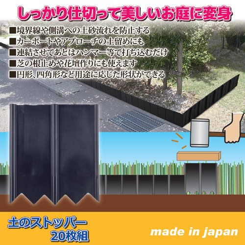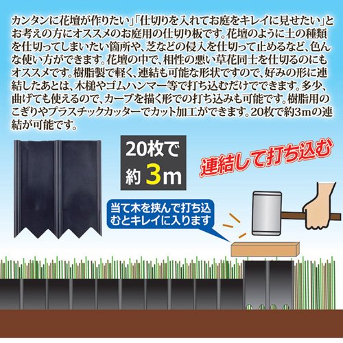 しっかり仕切って美しいお庭に変身境界線や側溝への土砂流れを防止するカーポートやアプローチの土留めにも連結させてあとはハンマー等で打ち込むだけ芝の根止めや花壇作りにも使えます円形、四角形など用途に応じた形状ができる カンタンに花壇が作りたい」「仕切りを入れてお庭をキレイに見せたい」とお考えの方にオススメのお庭用の仕切り板です。花壇のように土の種類を仕切ってしまいたい箇所や、芝などの侵入を仕切って止めるなど、色んな使い方ができます。花壇の中で、相性の悪い草花同士を仕切るのにもオススメです。樹脂製で軽く、連結も可能な形状ですので、好みの形に連結したあとは、木槌やゴムハンマー等で打ち込むだけでできます。多少、曲げても使えるので、カーブを描く形での打ち込みも可能です。樹脂用のこぎりやプラスチックカッターでカット加工ができます。20枚で約3mの連結が可能です。●サイズ:約幅16×奥行1.4×高さ17.8cm ●重量:約87g ●材質:ポリプロピレン ●セット内容:20枚 ●生産国:日本 ●パッケージサイズ:18×17×19.5cm 1.9kg