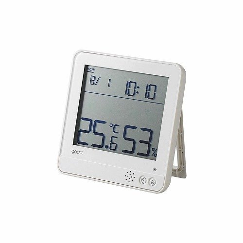遠くからでもハッキリ見える大画面モデル。温度と湿度を計測し、熱中症とインフルエンザの危険性が高い空気の状態をお知らせする温湿度警告計“goud(ゴウド)"。温度と湿度を計測し、熱中症とインフルエンザの危険性が高い空気の状態をお知らせする温湿度警告計“goud(ゴウド)"です。 視認性の高いデジタル表示を採用し、遠くからでもハッキリ見える大画面モデルです。 音・光・アイコンの3つの方法で状態をお知らせします。音と光はON/OFF設定が可能です。 デスクなどの平面設置と、壁掛けの2スタイルで使用可能です。 オールシーズンで使える時計・日付け・曜日・めざまし機能が付いています。●温度測定可能範囲:0℃~50℃(最小単位0.1℃) ●温度測定精度:±1.5℃ ●湿度測定可能範囲:20%~90%(最小単位1%) ※ただし結露なきこと ●湿度測定精度:35%~75%:±5%、それ以外:±10% ●時計表示:12h/24h表示選択あり ●時計精度:±1秒/日 ●日付表示:月日表示、曜日表示 ●目覚まし機能:テンポアップアラーム ●電源:DC3.0V(単4形アルカリ乾電池x2本) ●警告方法:液晶表示、LED表示、音声アラーム(LEDと音声はON/OFF切り替え可能) ●警告表示:熱中環境2段階(注意、警告)/ウイルス環境2段階(注意、警告) ●音量:約70dB ●外形寸法:幅122mm×奥行24mm×高さ124mm ※スタンド収納時 ●重量:200g ※電池含まず ●カラー:ホワイト ●付属品:単4形アルカリ乾電池x2本(動作確認用)、説明書 ●保証期間:6カ月 ●その他:各値測定間隔:30秒/本製品は医療用・工業用ではありません/日常生活での温湿度の目安としてご使用ください。
