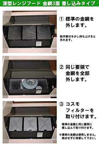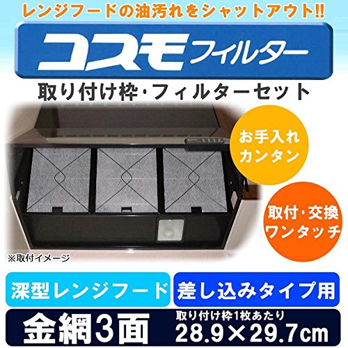 油汚れをシャットアウト 難燃性ガラス繊維フィルター コスモフィルター 深型レンジフード 金網3面 差し込みタイプ用 取り付け枠・フィルターセット 28.9×29.7cm [簡易パッケージ品]